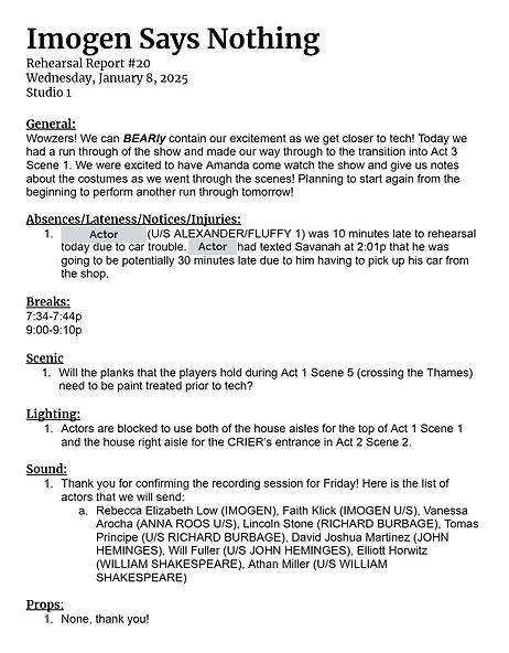 My team and I created reports after each rehearsal and performance to communicate with our creatives outside of the room on the discoveries and changes we made each day. Throughout my work, I've focused on the voice I use when writing notes to most effectively communicate. When reading back a note I've written, I anticipate what questions may arise and answer them clearly.